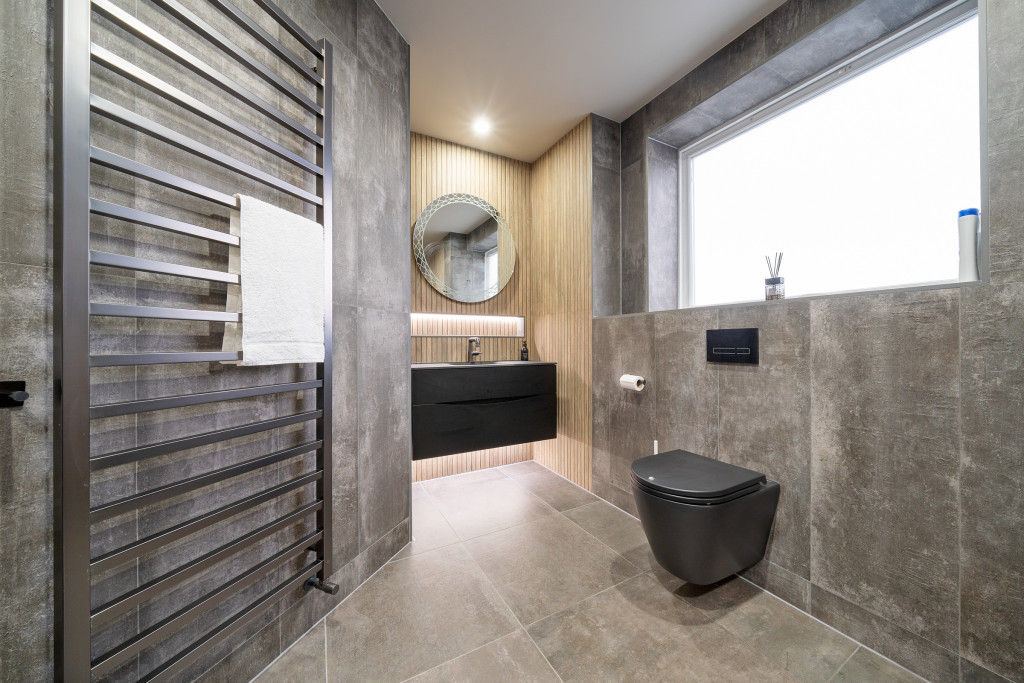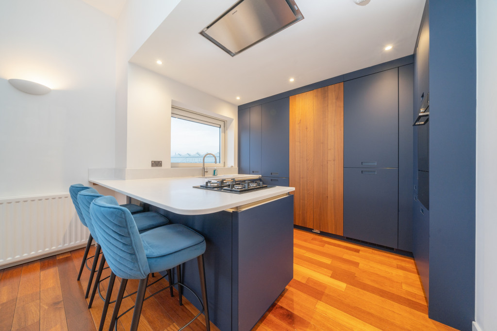 The modern fitted kitchen by Kitchens International is incredibly high spec, equipped with integrated Siemens appliances, including a gas hob, wine fridge, and a cleverly concealed bar area. A quartz-topped breakfast bar completes the look. There is also a handy utility room off the hall.