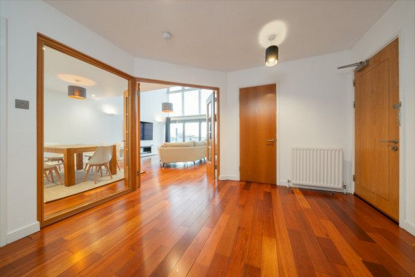 Step inside through a secure entry system into an impressive reception hallway, featuring a striking spiral staircase. The standout feature is the double-height, open-plan kitchen, dining, and living area, where floor-to-ceiling windows flood the living space with natural light. The private balcony offers the perfect spot to take in the riverfront views.